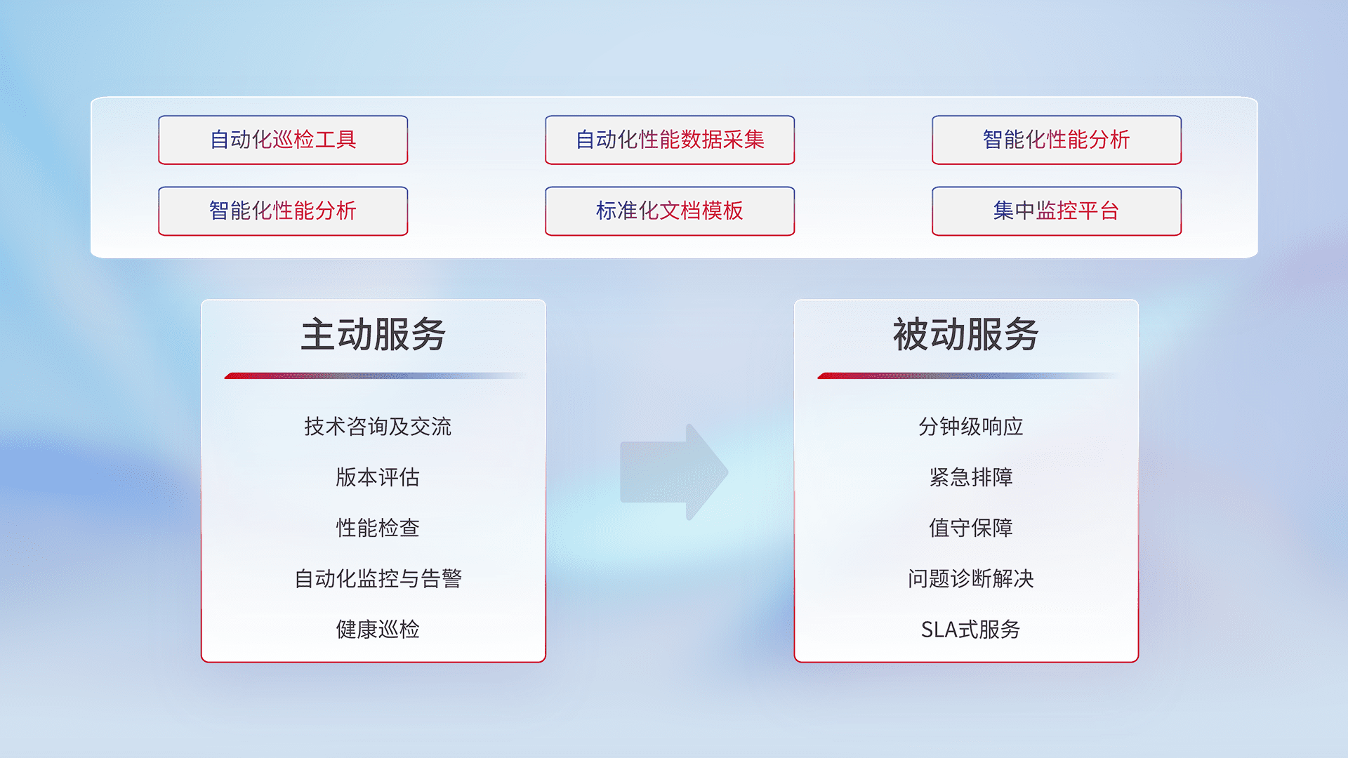 智能化工具和标准化文档,,保障服务质量,,提供主动服务(包含技术咨询、、版本评估、、、性能检查、、、、自动化监控与告警、、、、健康巡检)和被动服务包含(分钟级响应、、、、紧急排障、、值守保障、、、问题诊断解决、、、SLA服务)。。